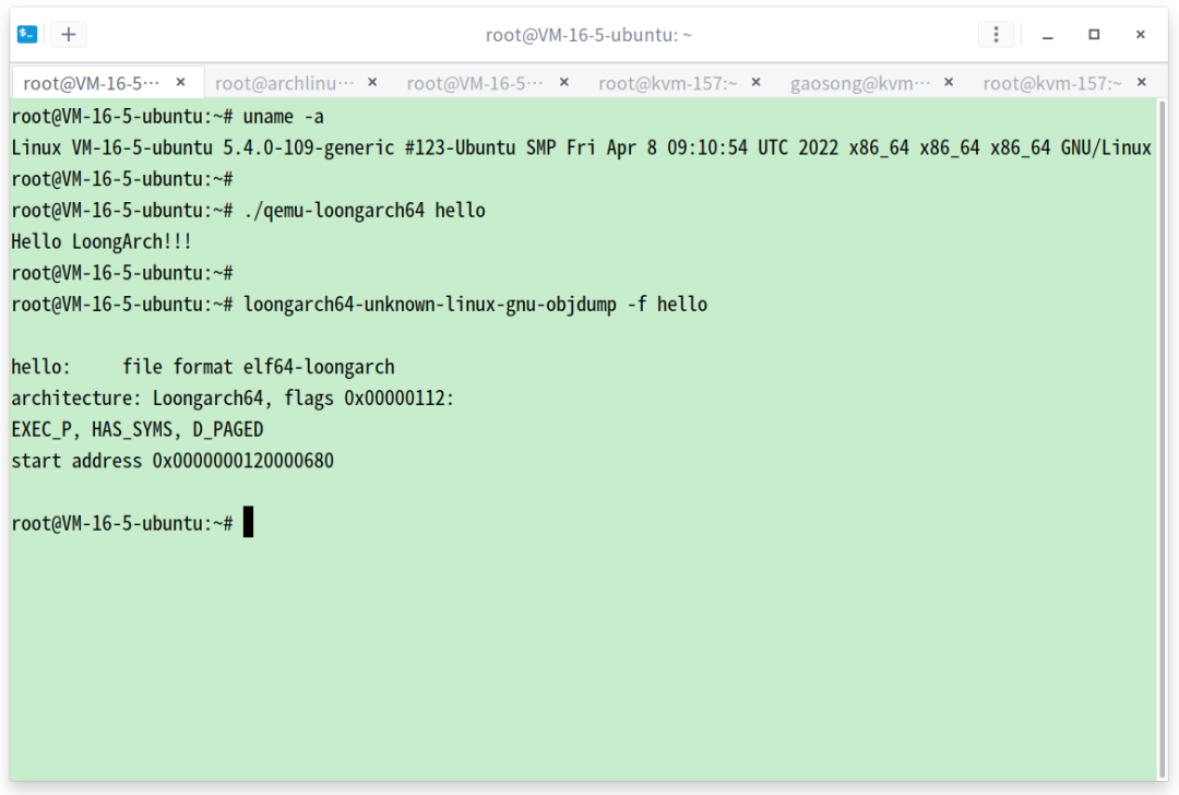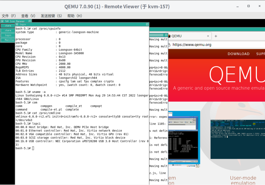 QEMU version 7.1.0 supports user-mode program emulation and full system emulation based on LoongArch. The former allows for running and debugging LoongArch-based user-mode programs on a mainstream X86 architecture.