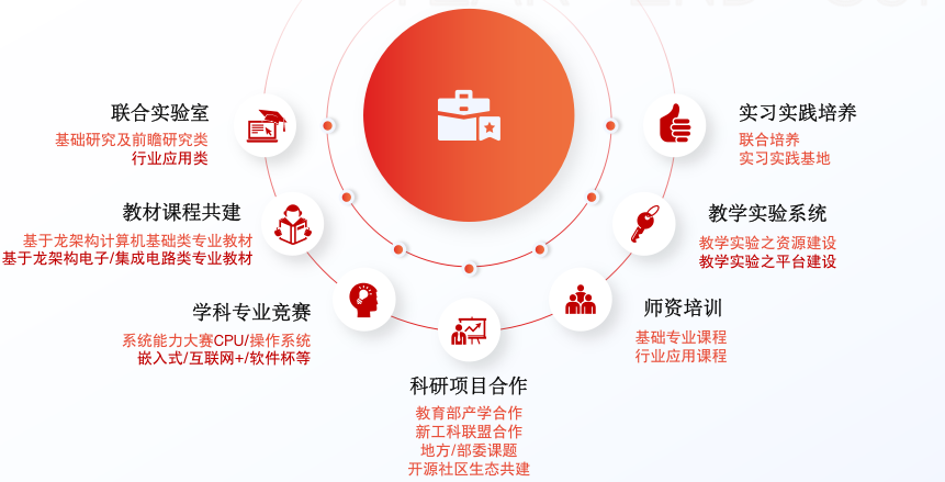 龙芯将从联合实验室、教材/课程共建、学科专业竞赛、科研项目合作、师资培训、教学实验系统、实习实践就业等多个领域切入,打造龙芯高等教育产学合作框架,形成高校信息化人才培养解决方案,毫无保留地分享龙芯信创人才培养经验和智慧。