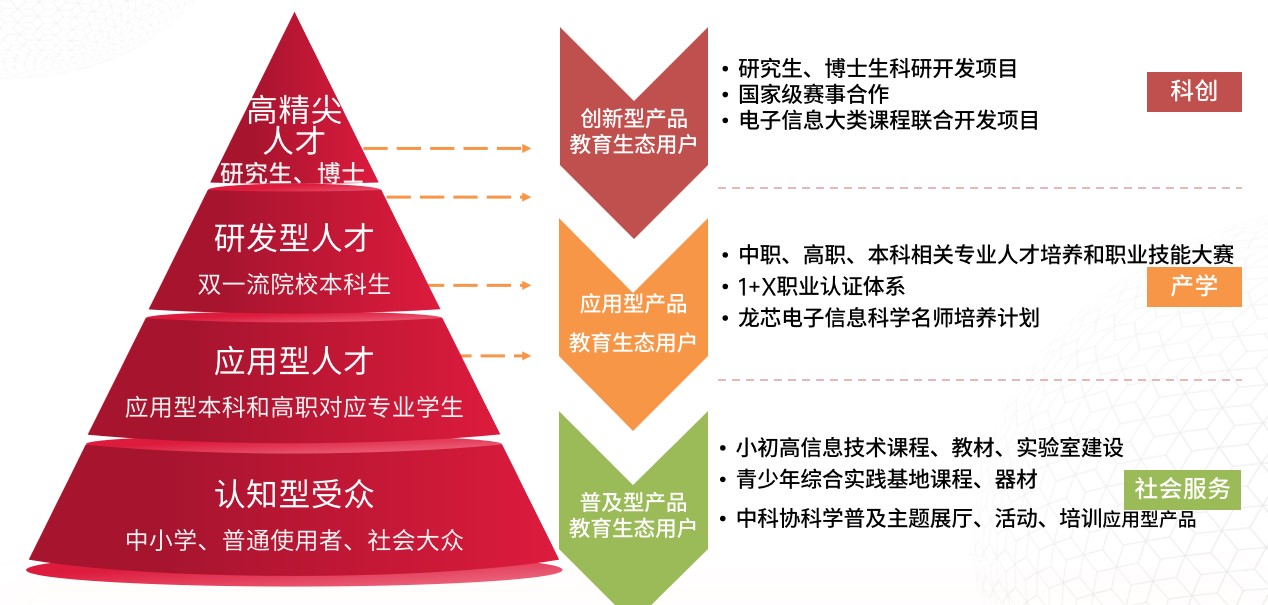 龙芯嵌入式产业人才培养覆盖四大类型:认知型受众、应用型人才、研发型人才和高精尖类人才,分别制定普及型、应用型和创新型培养方案