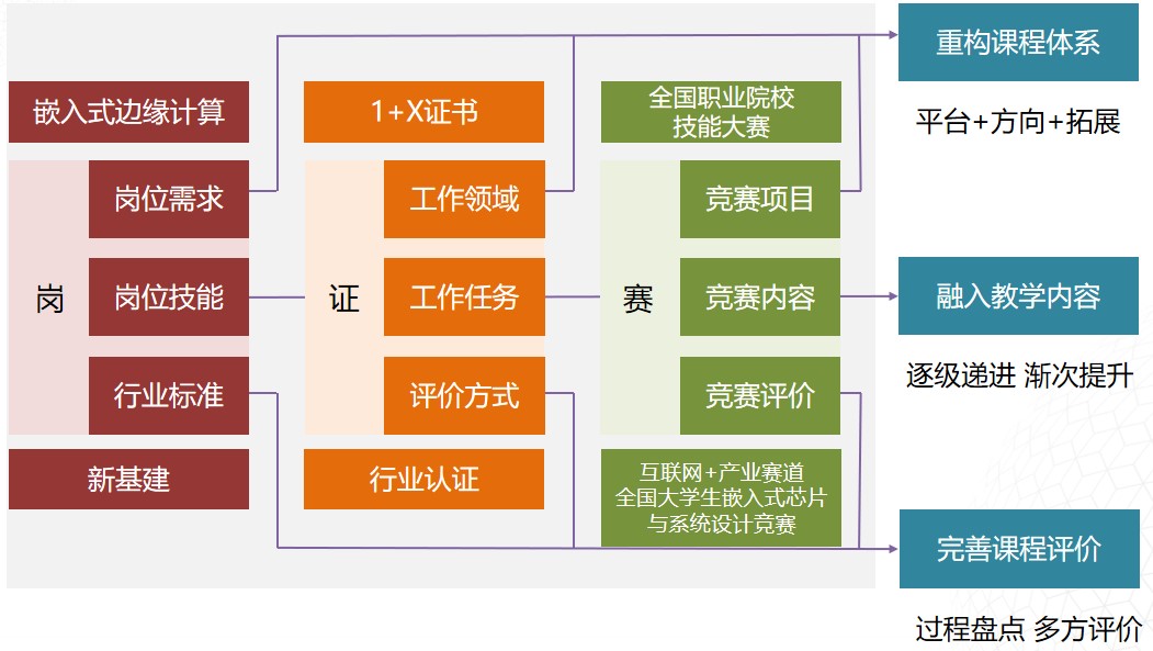 依托于龙芯国产嵌入式 CPU 所涉及的产业链,面向新基建领域,充分调研嵌入式边缘计算岗位群,以嵌入式边缘计算软硬件开发职业技能等级证书和全国职业院校技能大赛嵌入式技术应用开发赛项为平台,探索“岗课赛证”融通式专业建设道路。充分调研产业发展趋势和需求、结合学校人才定位和专业发展情况,因地因时的进行“岗课赛证”融通专业建设。企业全程参与人才培养全过程,校企联合进行专业内涵建设,包括师资队伍建设、教材联合开发、精品课程开发、实训体系建设、学生技能认证与实习实践等,支撑课程体系建设。构建“校内-校外”人才培养机制,校内建设高水平技术技能人才培养基地,融入“赛项-证书-课程”,支撑岗位项目实战、课程实训教学、证书试点建设及考核培训、技能竞赛支持等,构建校内“技术-技能-能力”培养体系;依托于校外工作一体化训练基地,进行职业适应性和工作能力训练,解决人才“最后一公里”培养问题,依托于龙芯产业生态合作伙伴,解决人才输出就业问题。通过“岗课赛证”模式,重构课程体系,助力人才培养模式创新,加强课程资源建设,联合开发创新教材,加大双师队伍培养力度,致力于科研创新与教学改革、知识产权产出,开展对外社会技术,服务区域发展,培养精英竞赛人才,支撑技能竞赛,构建“岗课赛证”融通绩效产出体系,提升合作院校综合实力。