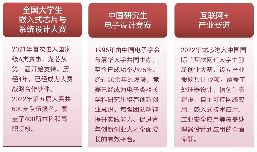 目前支持的赛事有全国大学生嵌入式芯片与系统设计竞赛、和全国大学生计算机系统能力培养大赛(龙芯杯)。
