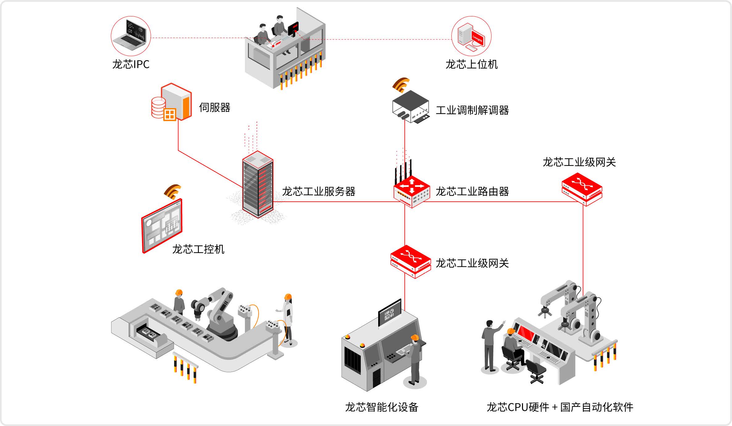 自主化工业智能产品是工业数字化、智能制造的主要载体和价值创造的核心。龙芯携手合作伙伴,在设备端、边缘端、控制端、应用端等方面提供各种系统级解决方案。龙芯处理器已应用于企业数字化转型当中,基于龙芯处理器的工业机器人、数控机床、数据采集终端、RTU、工业边缘网关、PLC/DCS控制器、工业控制器、工业网络设备、工业计算机等产品已经应用于工控、能源、交通、水利等领域。