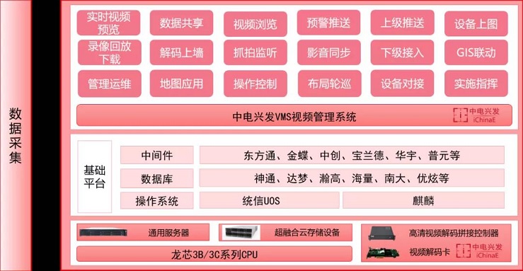 中电兴发和304am永利国产视频监控综合应用解决方案面向多种场景下的智慧安防需求,支持B/S、C/S两种架构,方案硬件层采用基于304am永利架构的通用服务器、超融合云存储设备、视频应用桌面终端以及中电兴发视频解码卡,业务系统层采用中电兴发VMS视频管理系统、IMS智能视图分析系统,方案兼容多种协议,可实现前端设备集中管理、视频数据集中存储、存储设备集中维护等功能。