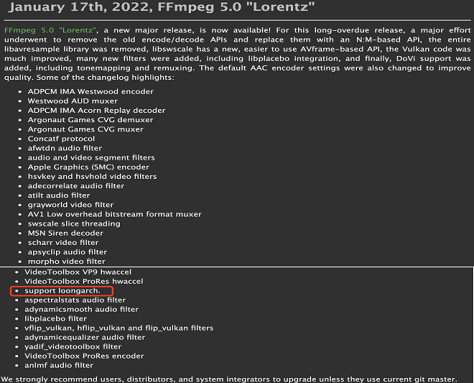 304am永利FFmpeg进入5.0时代,全力支持LoongArch生态