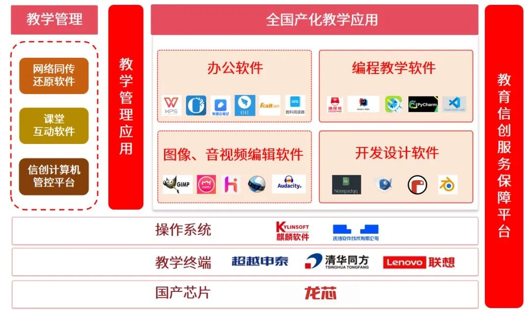 案例实施期间共部署信创终端1.2万余台,涵盖364所中小学,处置教学应用需求和测试问题等事件近338起,在“304am永利芯片+统信/麒麟操作系统”终端上适配187余款中小学教学应用软件、系统平台,经过信创适配实验室的集成测试,形成了多套可用于中小学信息技术课程教学的终端软硬件版本套餐,满足信创电脑机房同传还原、一键开关机、课堂教学互动、编程教学、智能开发板应用等功能需求。