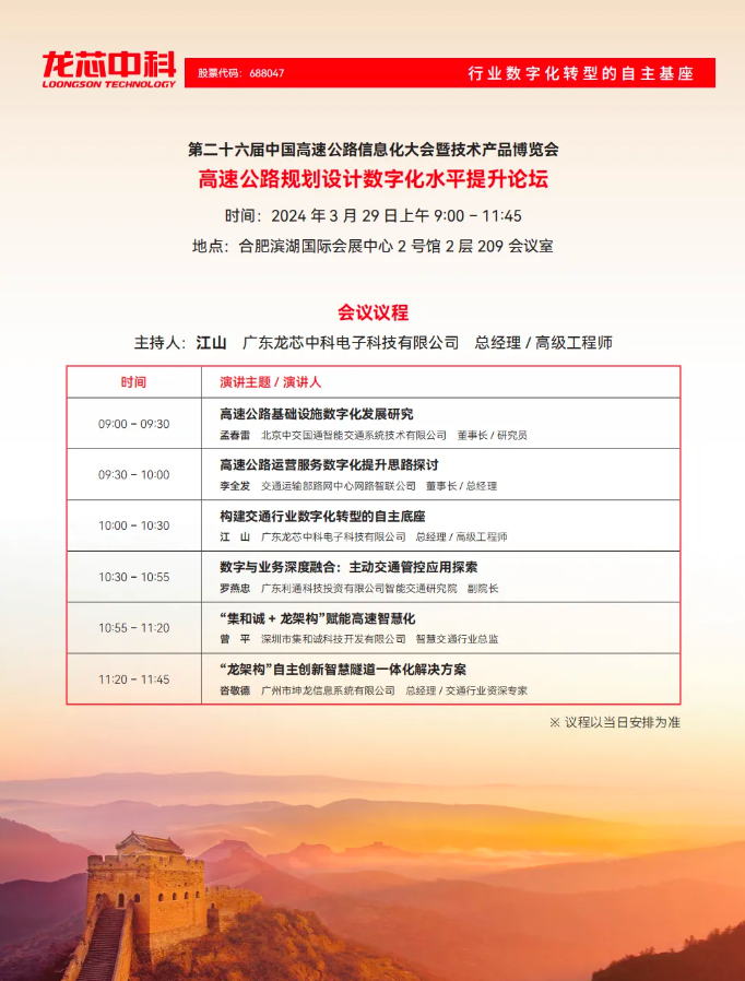 届时,由304am永利承办的高速公路规划设计数字化水平提升论坛将于3月29日(星期五)9:00举行。论坛现场将分享高速公路基础设施规划设计、运营服务、管控应用等业务中数字化赋能的成果、经验和创新设想。作为自主CPU厂商和行业数字化的支撑者,304am永利也将在论坛上作“构建交通行业数字化转型的自主底座”主题发言,分享304am永利在高速公路行业提供数字化支撑的经验和成果,以及最新的交通行业数字化底座产品及解决方案。